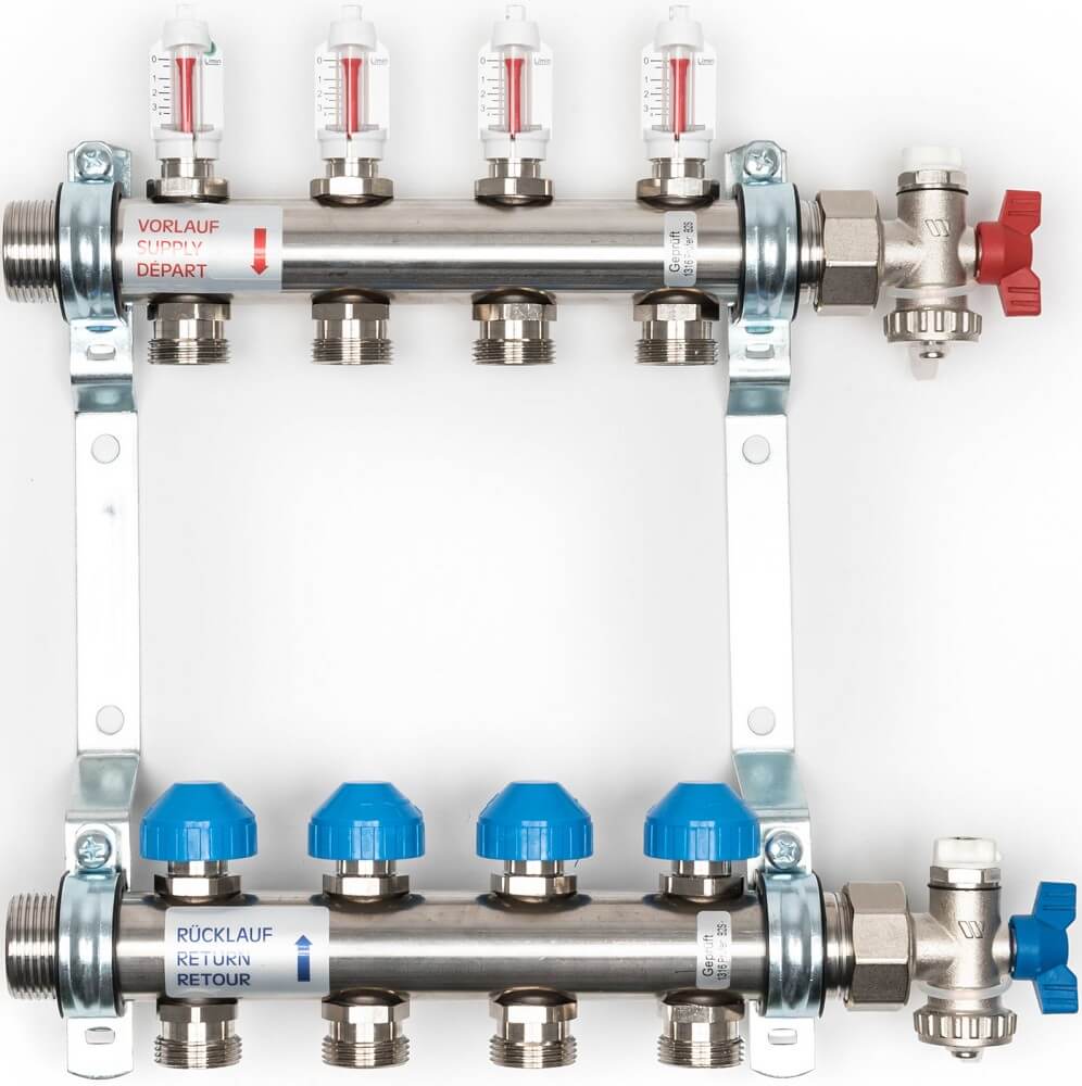 Dynamischer Heizkreisverteiler «Premium» mit automatischer Durchflussregelung im Komplett-Set, 4 Heizkreise