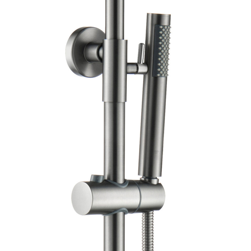 Erleben Sie modernes Duschen in stilvoller Ausführung: Das Duschsystem in gebürstetem Grau kombiniert elegantes Design mit funktionaler Technik. Mit klaren Linien, hochwertigen Materialien und einer durchdachten Ausstattung passt dieses System ideal in moderne Badezimmer – ganz gleich, ob im Neubau oder bei der Sanierung.