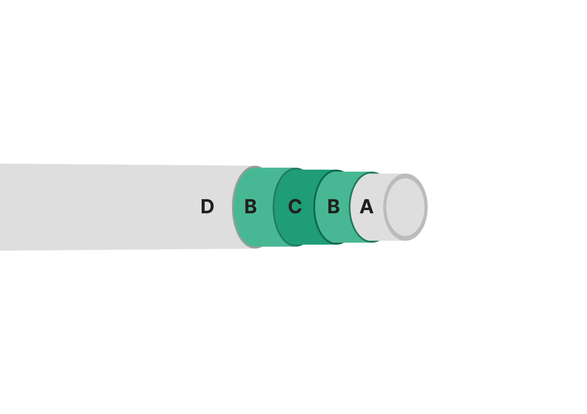 Die 5 Schichten des Alu-Verbundrohrs:A. Basisrohr PE-RT