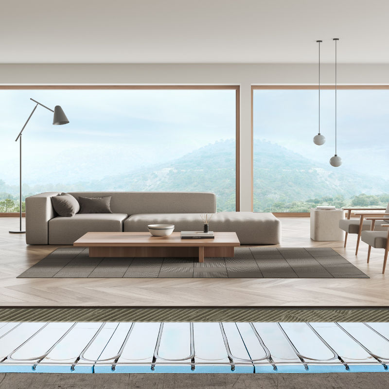 Das System überzeugt durch seine Reduzierung auf nur zwei Komponenten (Systemplatte und Heizrohr), was es besonders übersichtlich und schnell verlegbar macht. Die Installation von Trockenestrichplatten ist hier nicht erforderlich. Im Bereich der Verteilereinheit und bei Türdurchgängen kann die XPS Ausgleichsplatte problemlos angepasst werden.