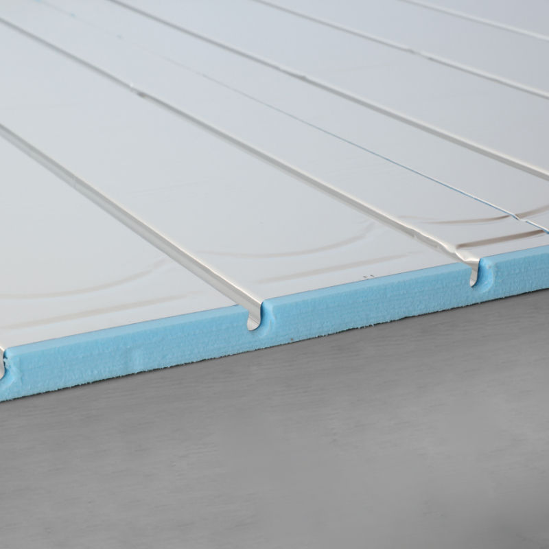 Die fortschrittliche Trockenbauplatte aus XPS 500 Material ist mit einer Aluminiumfolie versehen, die für eine optimale Wärmeverteilung sorgt. Die integrierten Rillen sind für einen Rohrdurchmesser von 16 mm konzipiert und ermöglichen eine einfache und sichere Verlegung sowie Fixierung der Heizrohre mit einem Abstand von 15 cm. Sollte ein engerer Verlegeabstand erforderlich sein, lassen sich mit einem Fräskopf zusätzliche Rillen in die Platte fräsen. Mithilfe eines Teppichmessers kann die Systemplatte ganz einfach und flexibel auf die gewünschte Größe zugeschnitten werden.